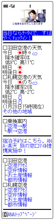 携帯電話をはじめ多種多様な機器のアクセスに対応するには、アクセス元の機種を特定して表示可能なコンテンツに調整する必要があります。ANAでは、機種 を判別して対応するコンテンツを自動生成しており、これらの処理をWebスクリプト言語PHPで実現しています。 |