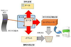 | モニタ機能には、PHPの実行状況をルールに照らし合わせて常時監視します。ルールに抵触するPHP処理を発見するとその状況を記録します。さらに、メールによる報告やコードトレース(ステップ単位の実行状況記録)の採取を実施します。 |